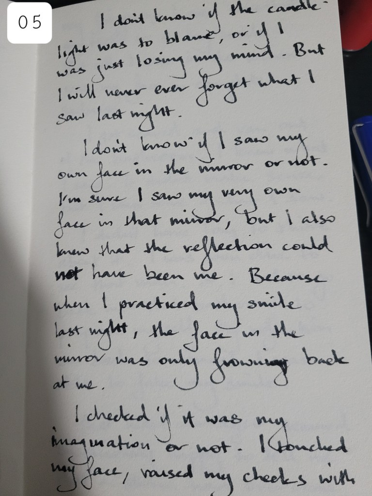 I don’t know if I saw my own face in the mirror or not. I’m sure I saw my very own face in that mirror, but I also knew that the reflection could not have been me. Because when I practiced my smile last night, the face in the mirror was only frowning back at me.