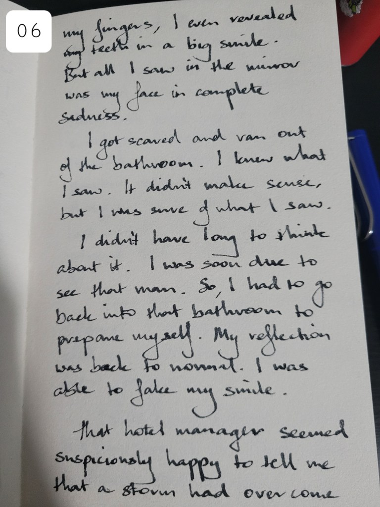 I didn’t have long to think about it. I was soon due to see that man. So, I had to go back into that bathroom to prepare myself. My reflection was back to normal. I was able to fake my smile.
