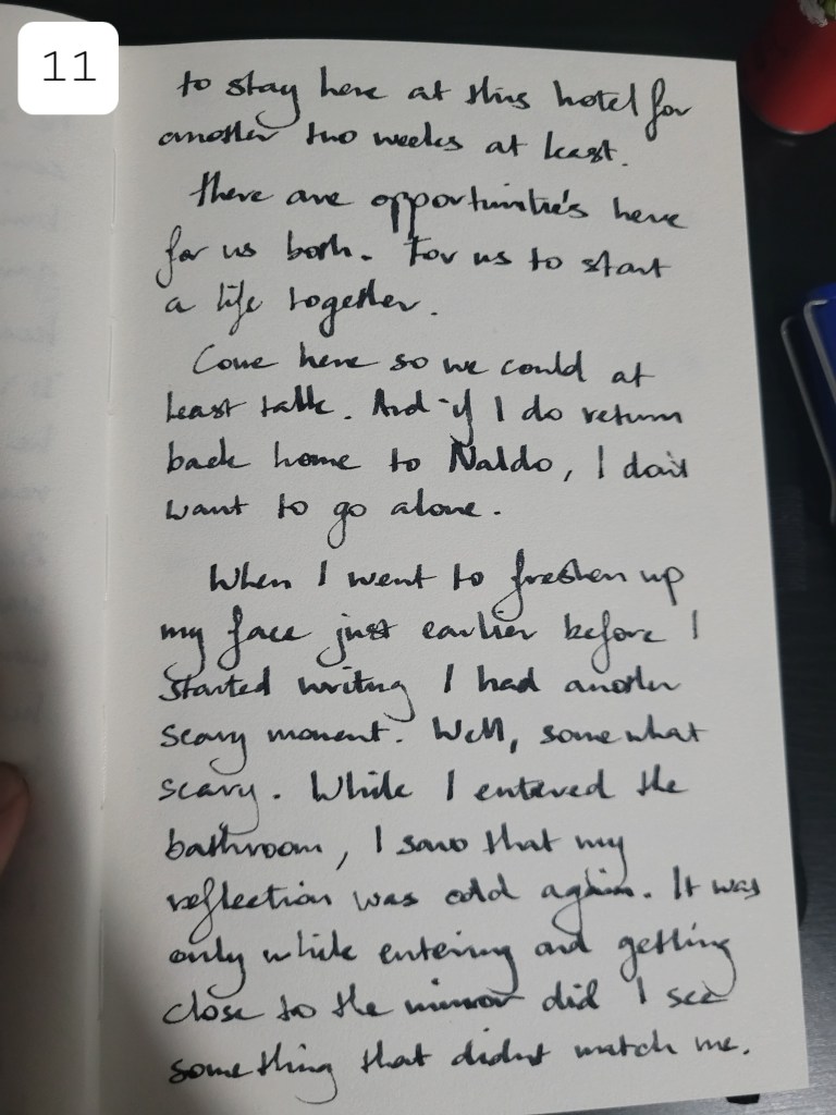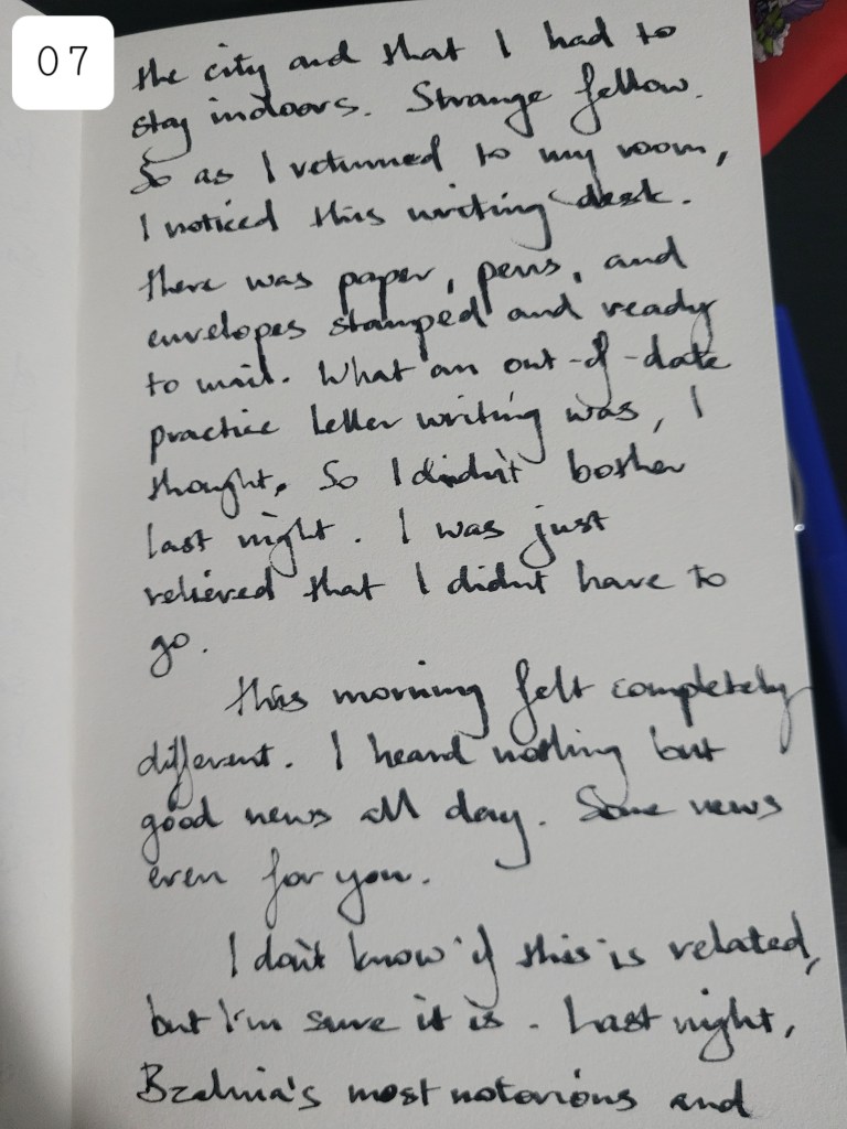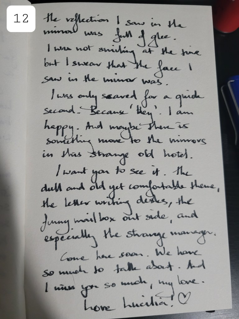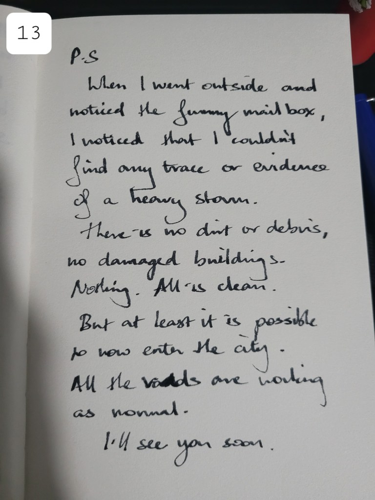 That hotel manager seemed suspiciously happy to tell me that a storm had overcome the city, and that I had to stay indoors. Strange fellow. So, as I returned to my room, I noticed this writing desk.