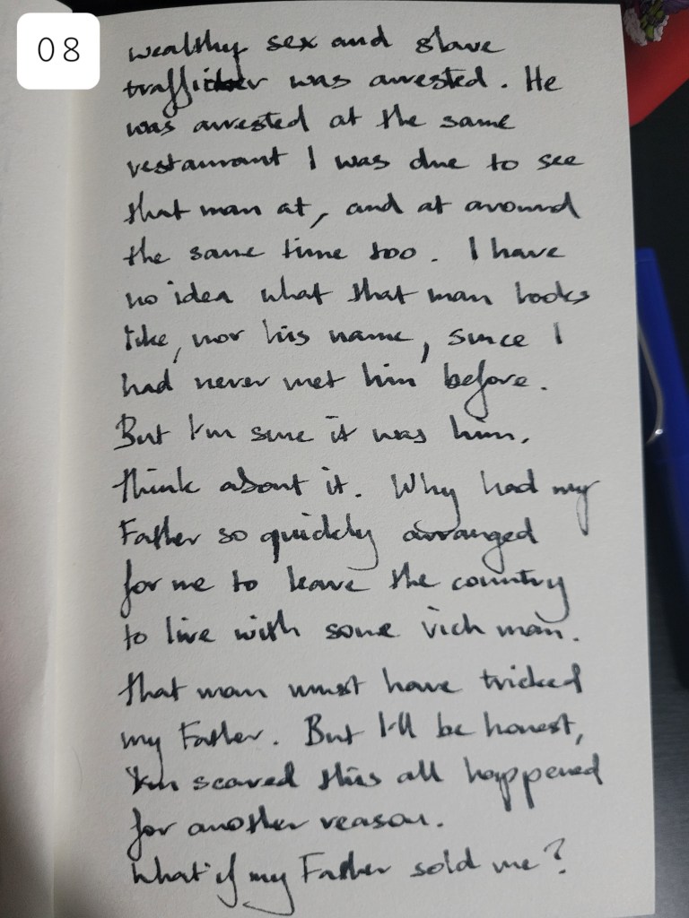 Think about it. Why had my father so quickly arranged for me to leave the country to live with some rich man. That man must have tricked my father. But I’ll be honest, I’m scared this all happened for another reason. What if my father sold me?