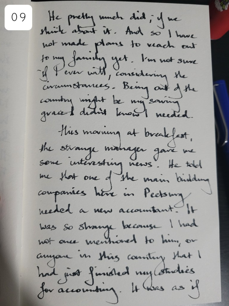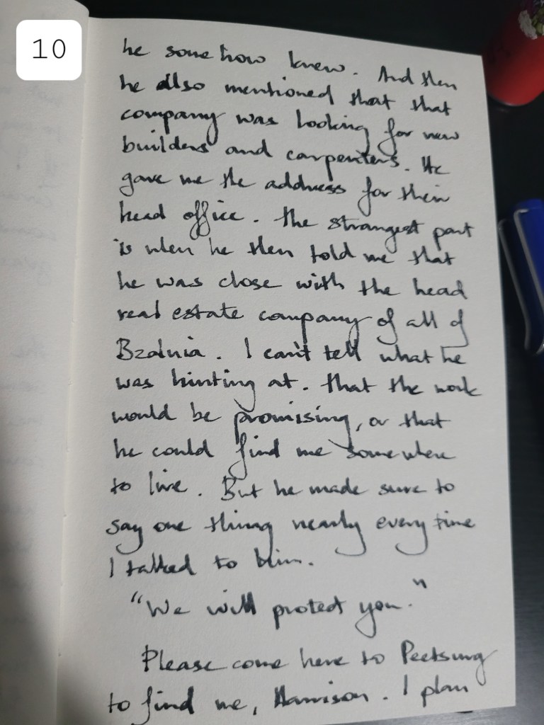 This morning at breakfast, the strange manager gave me some interesting news. He told me that one of the main building companies here in Peetsurg needed a new accountant. It was so strange because I had not once mentioned to him, or to anyone in this country, that I had just finished my studies for accounting. It was as if he somehow knew. And then he also mentioned that that company was looking for new builders and carpenters. He gave me the address for their head office. The strangest part is when he told me that he was close with the head real estate company of all of Bzalnia. I can’t tell what he was hinting at. That the work would be promising, or that he could find me somewhere to live. But he made sure to say one thing nearly every time I talked to him.