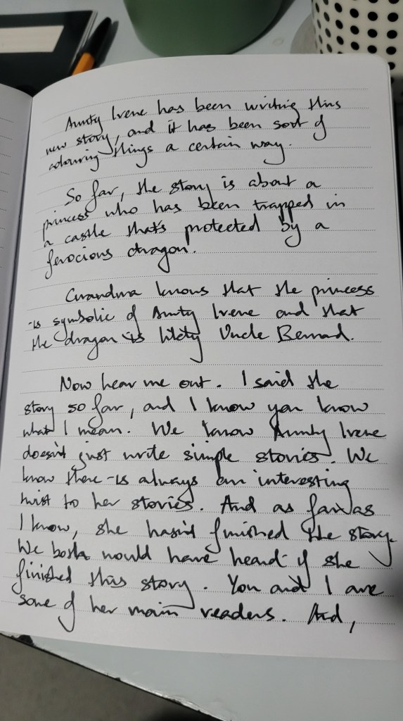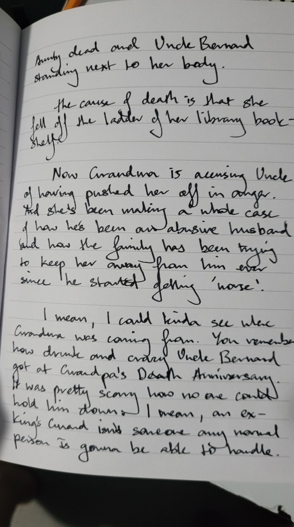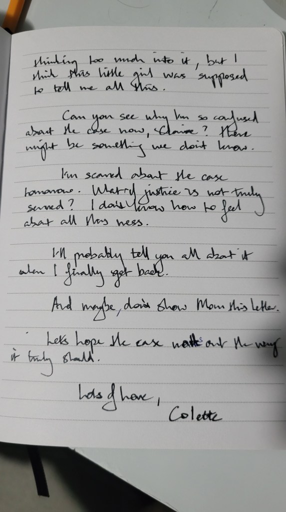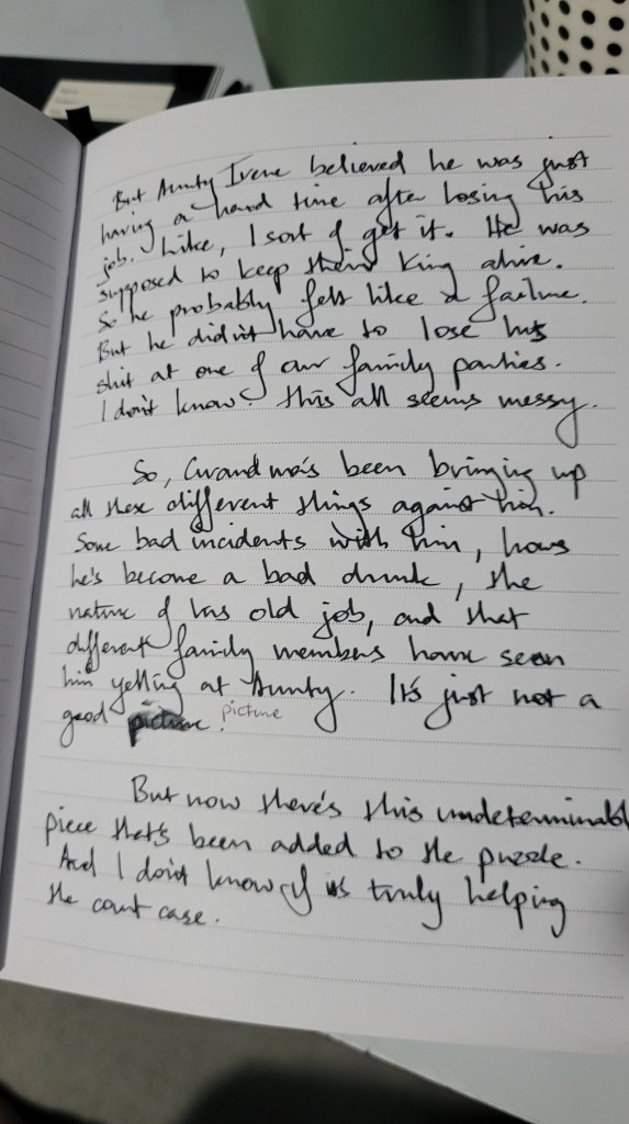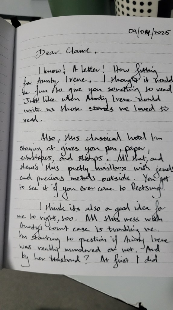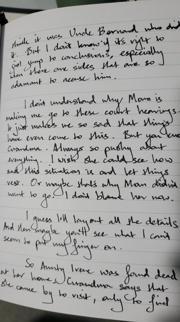 I think it’s also a good idea for me to right, too. All this mess with Aunty’s court case is troubling me. I’m starting to question if Aunty Irene was really murdered or not. And by her husband? At first, I did think it was Uncle Bernard who did it. But I don’t know if it’s right to just jump to conclusions, especially when there are sides that are so adamant to accuse him.