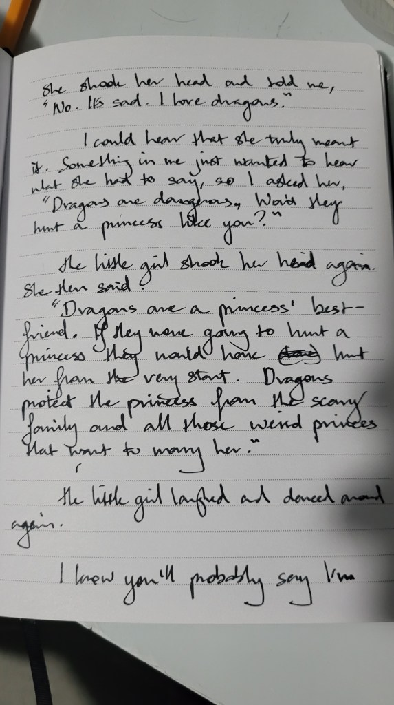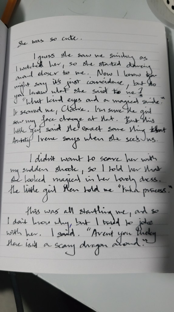 I didn’t want to scare her with my sudden shock, so I told her that she looked magical in her lovely dress. The little girl then told me,