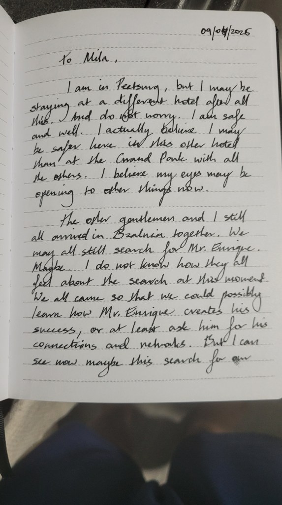 The other gentlemen and I still arrived in Bzalnia together. We may all still search for Mr. Enrique. Maybe. I do not know how they all feel about the search at the moment. We all came so that we could possibly learn how Mr. Enrique creates his success, or at least ask him for his connections and networks. But I can see now, maybe this search for our missing boss may not feel worthwhile for everybody anymore.