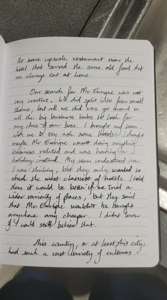 Our search for Mr. Enrique was not very creative. We did split into four small teams, but all we did was go around all the big business hubs to look for any clues of our boss. I brought my team with me to try ask some hotels. I thought maybe Mr. Enrique wasn’t doing anything business related and was having a holiday instead. My team understood how I was thinking, but they only wanted to check the most classiest of hotels. I told them it would be better if we tried a wider variety of places, but they said that Mr. Enrique wouldn’t be caught anywhere any cheaper. I didn’t know if I could still believe that.