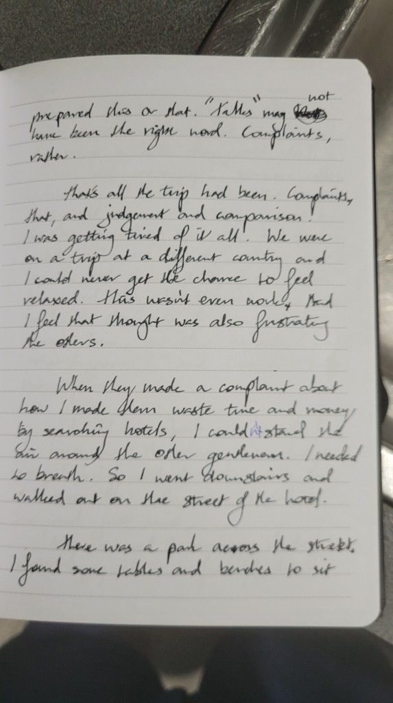 That’s all the trip had been. Complaints. That, and judgement and comparison. I was getting tired of it all. We were on a trip at a different country, and I could never get the chance to feel relaxed. This wasn’t even work. And I feel that thought was also frustrating the others.