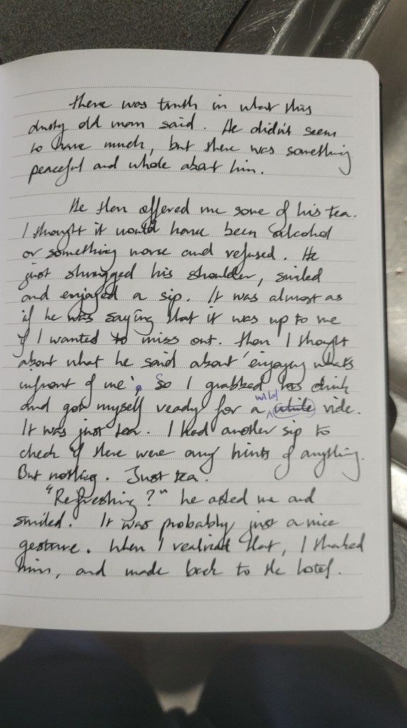 He then offered me some of his tea. I thought it would have been alcohol or something worse and refused. He just shrugged his shoulders, smiled, and enjoyed a sip. It was almost as if he was saying that it was up to me if I wanted to miss out. Then I thought about what he said about “enjoying what’s in front of me”. So, I grabbed his drink and got myself ready for a wild ride. It was just tea. I had another sip to check if there were any hints of anything. But nothing. Just tea.