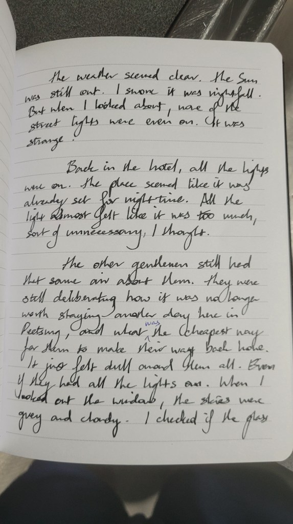 The other gentlemen still had that same air about them. They were still deliberating how it was no longer worth staying another day here in Peetsurg, and what was the cheapest way for them to make their way back home. It just felt dull all around them. Even if they had all the lights on. When I looked out the window, the skies were grey and cloudy. I checked if the glass was darkened, but it was hard to tell. I swore that I remembered that it was bright and sunny outside. It felt too miserable being indoors with all of them, so I decided to just go outside. I asked if any of them wanted to join me outside. When they all refused, I just shrugged my shoulders and smiled.