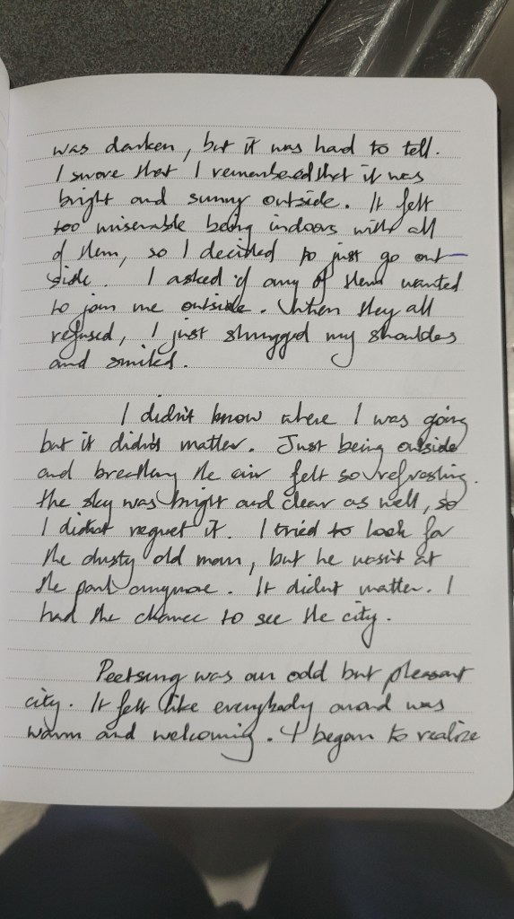 I didn’t know where I was going but it didn’t matter. Just being outside and breathing the air felt so refreshing. The sky was bright and clear as well, so I didn’t regret it. I tried to look for the dusty old man, but he wasn’t at the park anymore. It didn’t matter. I had a chance to see the city.