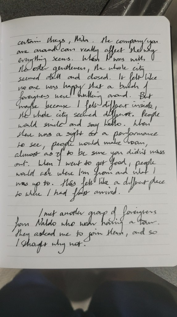 Peetsurg was an odd but pleasant city. It felt like everybody around was warm and welcoming. I began to realize certain things, Mila. The company you are around can really affect the way everything seems. When I was with the other gentlemen, the whole city seemed dull and closed. It felt like no one was happy that a bunch of foreigners were walking around. But maybe because I felt different inside, the whole city seemed different. People would smile and say hello. When there was a sight or a performance to see, people would make room, almost as if to be sure you didn’t miss out. When I went to get food, people would ask where I’m from and what I was up to. This felt like a different place to where I had first arrived.