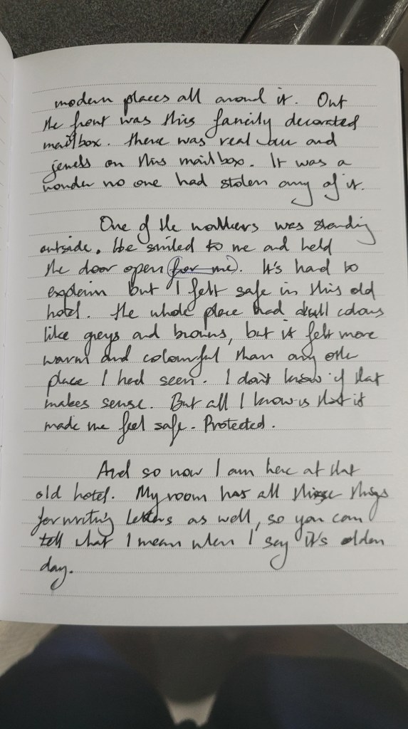 One of the workers was standing outside. He smiled to me and held the door open. It’s hard to explain but I felt safe in this old hotel. The whole place had dull colours, like greys and browns, but it felt more warm and colourful than any other place I had seen. I don’t know if that makes sense. But all I know is that it made me feel safe. Protected.